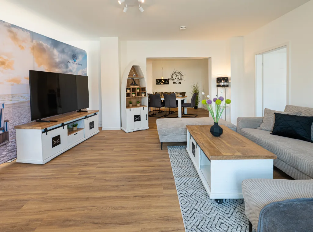 Das moderne und zentrale Apartment „Captain’s Nest“ im Sansibar-Stil für bis zu 8 Personen wurde 2025 komplett saniert und ist besonders klimafreundlich. Mitten in der Innenstadt, nur wenige Minuten zu Fuß von Havenwelten und Deichpromenade entfernt, überzeugt das Apartment durch einen kleinen Balkon, zwei Balkonaustritte sowie eine Garage. Außerdem wird ein Parkausweis zum kostenfreien Parken an der Straße bereit gestellt. Das Apartment in der 2. Etage (ohne Aufzug) bietet vielfältige Übernachtungsmöglichkeiten: ein Schlafzimmer mit zwei Einzelbetten (auch als Doppelbett nutzbar), ein Schlafzimmer mit einem 1,60m breiten Doppelbett, zwei Einzelbetten in einem abgetrennten Bereich im Wohnzimmer (auch als Doppelbett nutzbar) sowie eine sehr bequeme Schlafcouch im Wohnzimmer mit einer Liegefläche von 153 x 248cm. Alle Betten sind hochwertige Boxspringbetten. Weitere Annehmlichkeiten sind die Fußbodenheizung, eine kontrollierte Be- und Entlüftungsanlage, ein Schreibtisch, ein 65-Zoll Smart-TV und WLAN. Babybett und Hochstuhl auf Anfrage.